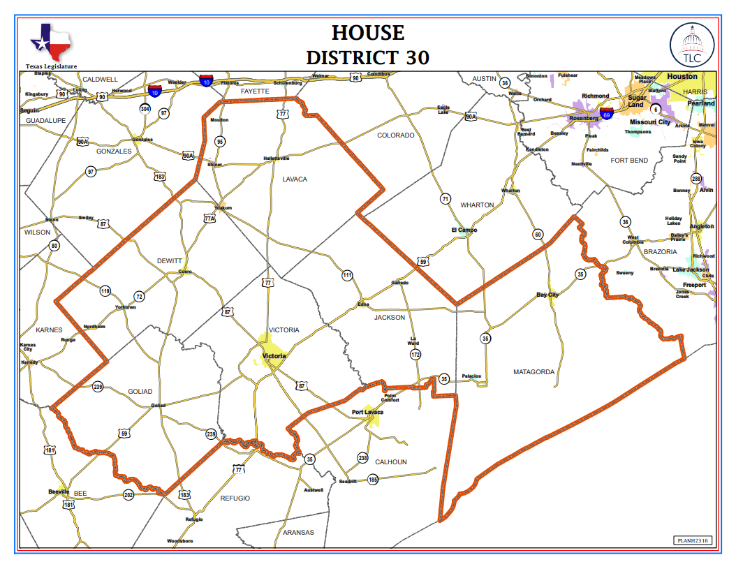 Bay City, Blessing, Bloomington, Cuero, Edna, Ganado, Goliad, Hallettsville, Inez, La Ward, Lolita, Markham, Matagorda, Midfield, Moulton, Nordheim, Palacios, Placedo, Quail Creek, Sargent, Shiner, Vanderbilt, Van Vleck, Victoria, Wadsworth, Yoakum (Part), and Yorktown