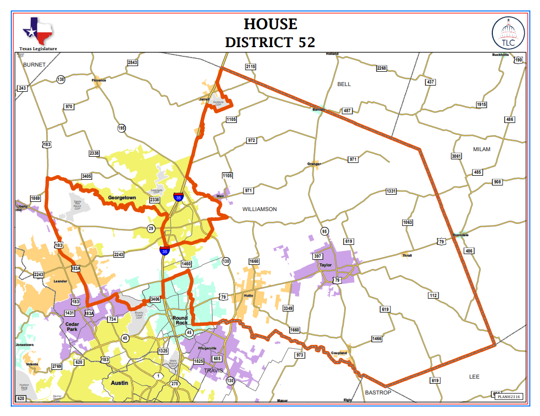 Bartlett (Part), Brushy Creek (Part), Cedar Park (Part) Coupland, Georgetown (Part), Granger, Hutto, Leander (Part), Liberty Hill (Part), Round Rock (Part), Santa Rita Ranch, Taylor, Thorndale (Part), Thrall, and Weir