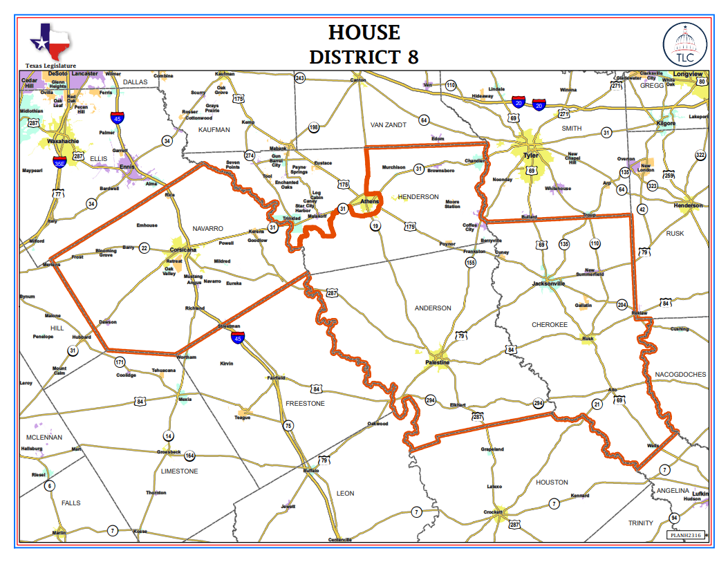 Alto, Angus, Athens (Part), Barry, Berryville, Blooming Grove, Brownsboro, Bullard (Part), Chandler, Coffee City, Corsicana, Cuney, Dawson, Elkhart, Emhouse, Eureka, Frankston, Frost, Gallatin, Goodlow, Jacksonville, Kerens, Mildred, Moore Station, Murchison, Navarro, Neches, New Summerfield, Oak Valley, Palestine, Powell, Poyner, Reklaw (Part), Retreat, Rice, Richland, Rusk, Shadybrook, Sunrise Shores, Troup (Part), and Wells