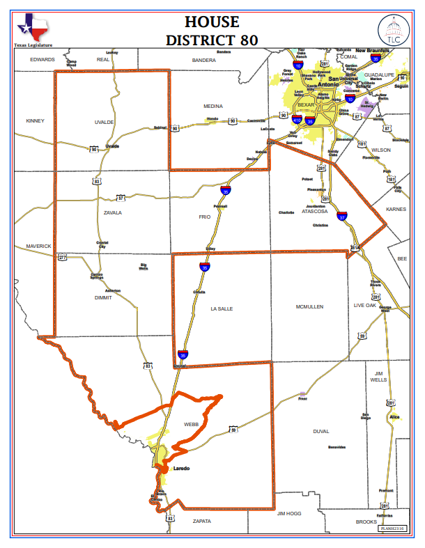 Aguilares, Amaya, Asherton, Batesville, Big Wells, Bigfoot, Brundage, Carrizo Hill, Carrizo Springs, Catarina, Charlotte, Christine, Chula Vista (Zavala), Colorado Acres, Crystal City, Dilley, El Cenizo, Hilltop, Hillside Acres, Jourdanton, Knippa, La Coma, La Moca Ranch, La Presa, La Pryor, Laredo (Part), Laredo Ranchettes, Laredo Ranchettes West, Las Haciendas, Las Pilas, Leming, Los Altos, Los Arcos, Los Centenarios, Los Fresnos, Los Huisaches, Los Nopalitos, Lytle (Part), Mirando City, Moore, North Pearsall, Oilton, Pearsall, Pleasanton, Poteet, Pueblo East, Pueblo Nuevo, Rancho Alegre, Ranchitos East, Ranchitos Las Lomas, Randolph AFB, Rio Bravo, Sabinal, San Carlos I, San Carlos II, Somerset, St. Hedwig, Tanquecitos South Acres, Tanquecitos South Acres II, Universal City (Part), Utopia, Uvalde, Uvalde Estates, Valle Verde, Von Ormy, and Zavala Ranch