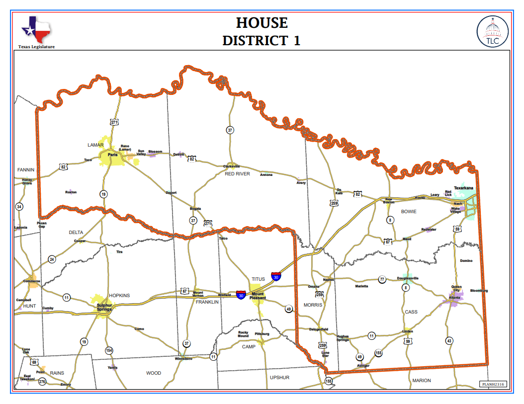 Annona, Atlanta, Avery, Avinger, Bivins, Bloomburg, Blossom, Bogata, Clarksville, Daingerfield, De Kalb, Detroit, Domino, Douglassville, Hooks, Hughes Springs, Leary, Linden, Lone Star, Maud, McLeod, Nash, Naples, New Boston, Omaha, Paris, Powderly, Queen City, Red Lick, Redwater, Reno (Lamar), Roxton, Sun Valley, Texarkana, Toco, Wake Village, and Winnsboro (Part)