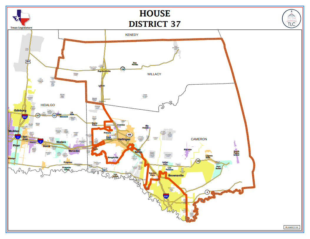 Arroyo Colorado Estates, Arroyo Gardens, Bayview, Brownsville (Part), Chula Vista, Combes, Del Mar Heights, Green Valley Farms, Harlingen, Indian Lake, Juarez, La Feria (Part), La Feria North, La Tina Ranch, Laguna Heights, Laguna Vista, Las Palmas II, Lasana, Laureles, Los Angeles, Los Fresnos, Lozano, Lyford, Olmito (Part), Orason, Palm Valley, Port Isabel, Port Mansfield, Primera (Part), Rancho Viejo, Rangerville (Part), Raymondville, Rio Hondo, San Benito (Part), San Pedro (Part), Santa Monica, Sebastian, South Padre Island, South Point, Villa del Sol, and Zapata Ranch