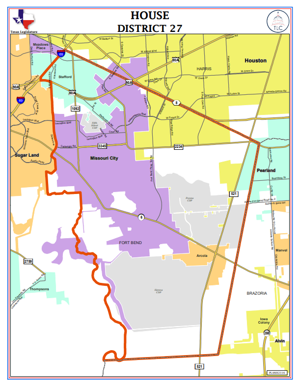 • House District: 27 (Missouri City)