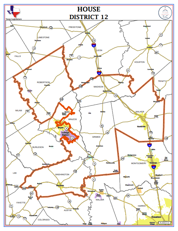Anderson, Bedias, Bremond, Bryan (Part), Burton, Calvert, Centerville, Chilton, Clifton, College Station (Part), Franklin, Hearne, Huntsville, Iola, Madisonville, Midway, Navasota, New Waverly, Normangee (Part), Pinebrook, Plantersville, Richards, Riverside, Shiro, Teague, Todd Mission, Waco (Part), Whitney, Wixon Valley (Part), Wortham, and Brenham