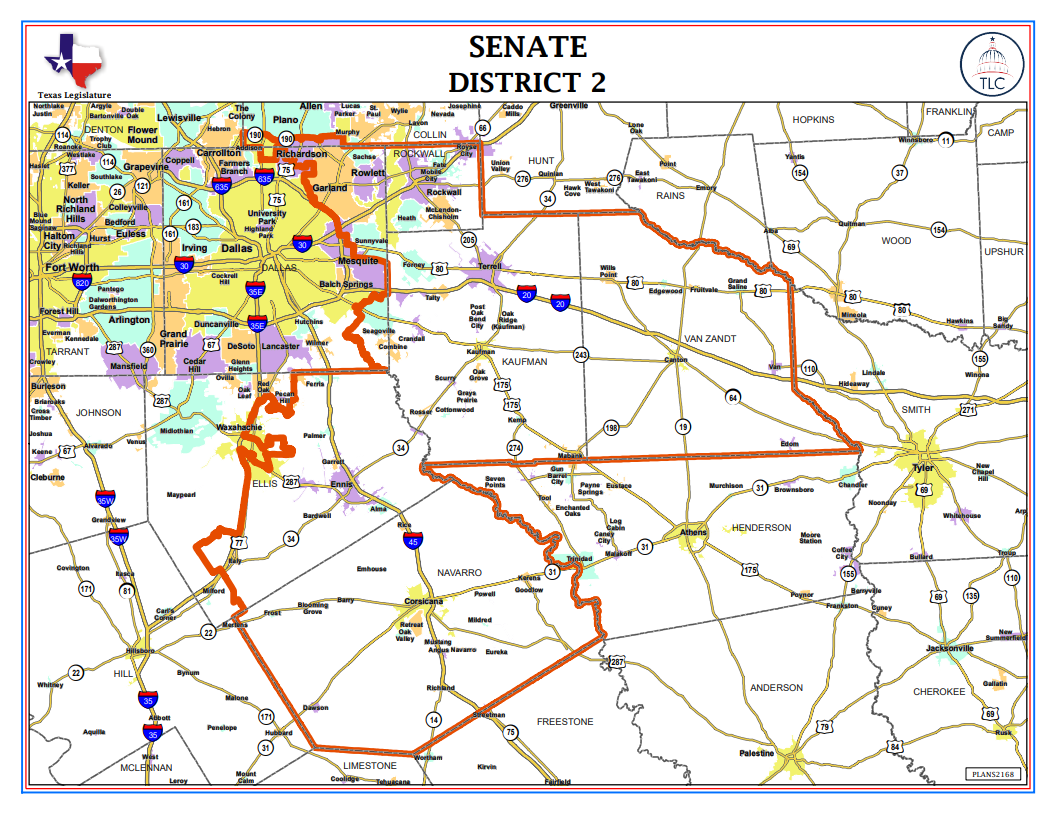- Alma, Angus, Bardwell, Barry, Ben Wheeler, Blooming Grove, Bristol, Callender Lake, Canton, Combine, Corsicana, Cottonwood, Crandall, Dallas (Part), Dawson, Edgewood, Edom, Elmo, Emhouse, Ennis, Eureka, Fate, Ferris, Forney, Frost, Fruitvale, Garland (Part), Garrett, Goodlow, Grand Saline, Grays Prairie, Heartland, Heath, Italy, Kaufman, Kemp, Kerens, Mabank (Part), McLendon-Chisholm, Mesquite (Part), Mildred, Mobile City, Myrtle Springs, Navarro, Oak Grove, Oak Ridge, Oak Valley, Palmer, Pecan Hill (Part), Post Oak Bend City, Powell, Red Oak (Part), Retreat, Rice, Richardson (Part), Richland, Rockwall, Rosser, Rowlett, Royse City (Part), Sachse (Part), Scurry, Seagoville (Part), Seven Points (Part), Sunnyvale, Talty, Terrell, Travis Ranch, Van, Waxahachie (Part), Wills Point, and Wylie (Part)