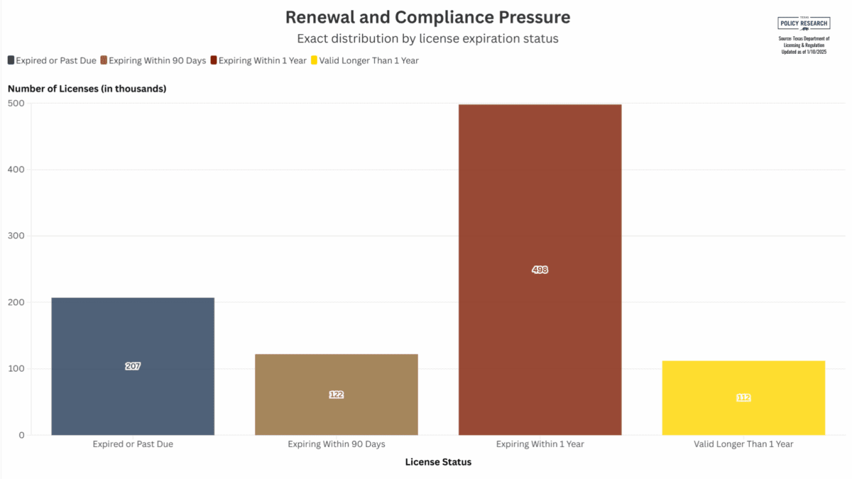 The Archbridge rankings provide a useful national comparison, but Texas’s own administrative data makes the implications tangible. A review of licensing records from the Texas Department of Licensing and Regulation (TDLR) shows nearly one million license records tied to work performed in the state.